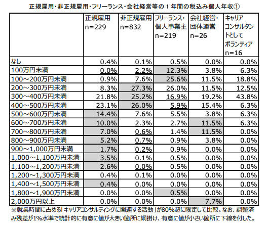 1. 正社員として企業に勤める場合、「500万円以上」の年収を得ている人が多い傾向にある
