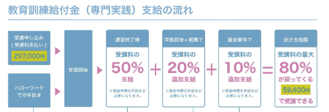 厚生労働省の「教育訓練給付制度」を利用すると、一定の条件を満たした講座の受講料の20%(最大10万円)が支給されます。また専門実践教育訓練給付金(最大80%)の給付を受けることもできます。